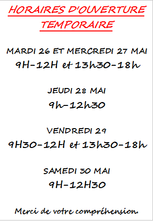 Horaires d’ouverture semaine du 19 au 23 mai