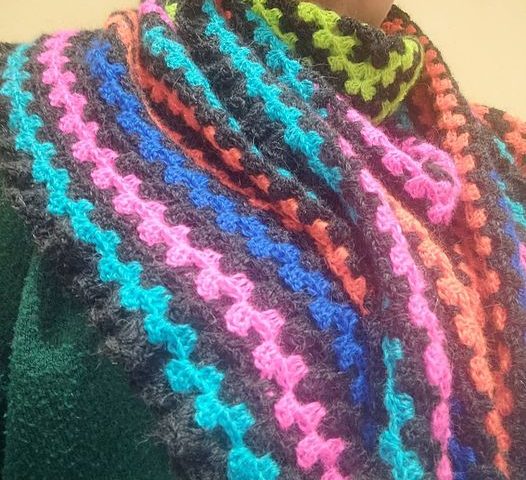 J’ai utilisé 1 mini set d’alpaga fluo et 2.5 écheveaux de noir (la bordure en