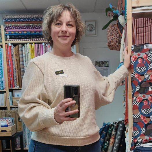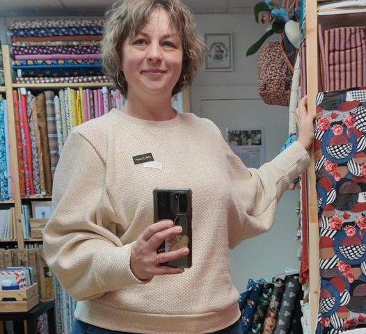 Je l’ai réalisé dans un tissu en coton et modal en tricot jersey blanc cassé et doré. Tissu idéal pour la demi saison.