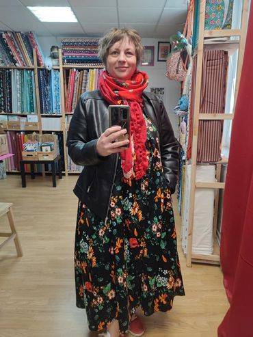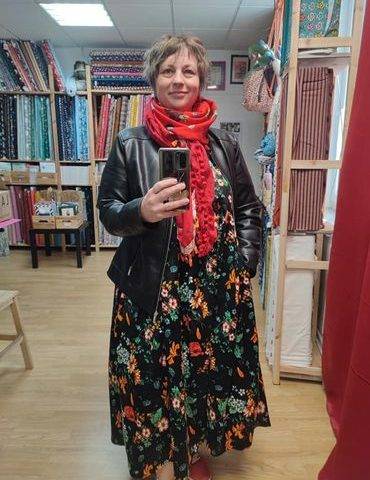 Je l’ai réalisée dans un satin de coton fond noir et fleuri, j’ai fait une taille en dessous car elle taille grand ?
