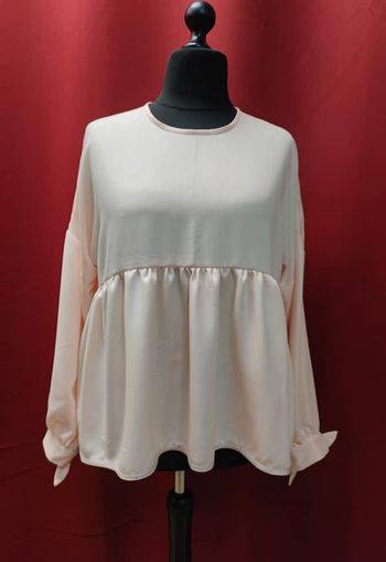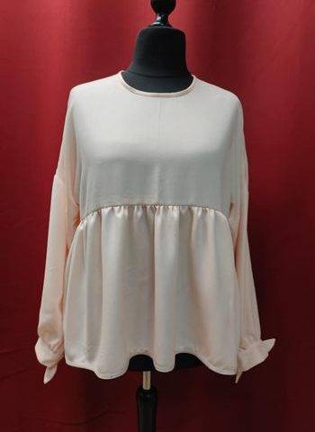 ? J’ai réalisé la blouse Lehoïa de chez Cha’ coud dans le serge de viscose nude de chez Eglantine et Zoé avec le biais Poésie Smokey de chez Atelier Brunette et des boutons doré rose à strass.