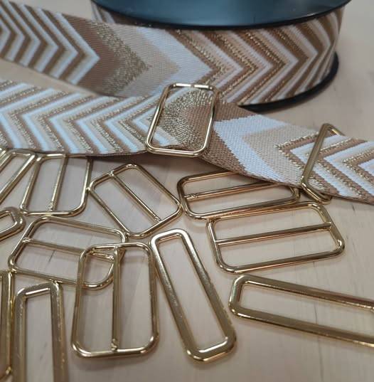 Quelques nouveautés arrivées avant Noël ? Une belle sangle à chevrons beige et doré et les rectangles et coulisse assortis. Et oui, j’ai repris du doré