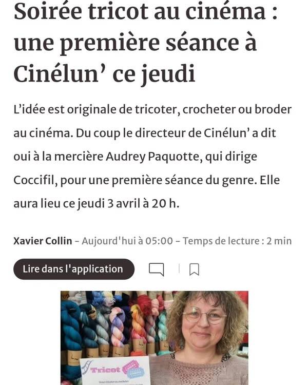 ? Un bel article dans @lestrepublicain ce matin pour vous annoncer le premier Tricot cinéma de COCCIfil en partenariat avec @cinelun .… En voir plus