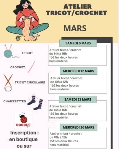 ? Voici les ateliers de Mars Tricot ou crochet Aiguilles droites ou circulaires Chaussettes… Apprendre les finitions ou un point particulier On s’adapte à votre projet […]