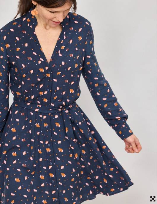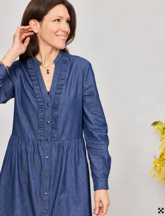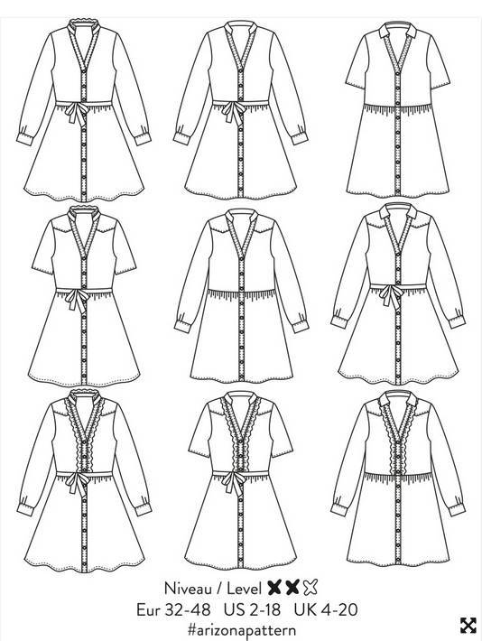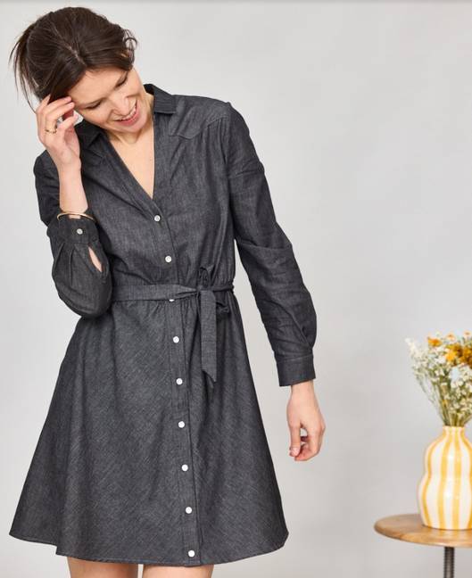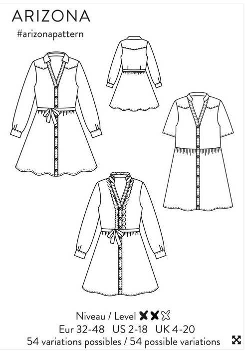 Robe chemise à l’encolure V et aux multiples possibilités: 3 options de cols (chemise, victorien ou pied de col seul) à mixer avec 3 options de jupe (rectangle froncé, quart de cercle ou demi-cercle). La robe peut se réaliser manche courte ou longue, et avec l’ajout d’un froufrou sur le devant ou non. Le tout avec, en option, l’ajout d’un empiècement épaule surpiqué pour une touche résolument western !