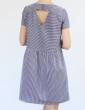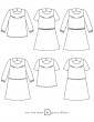Blouse droite aux manches courtes ou 7/8 froncées sur un bracelet de poignet. Empiècement doublé avec découpe oblique sur le devant, et joli décolleté V au dos surmonté d'une fine patte de boutonnage. Quelques fronces peu volumineuses sous les empiècements dos et devant. Déclinable en robe (taille élastiquée ou non). Finitions coutures anglaises et fourreau.