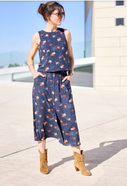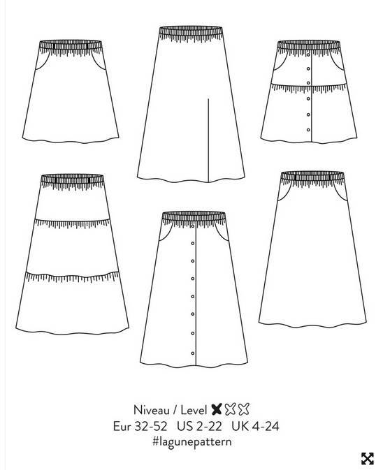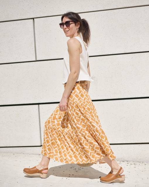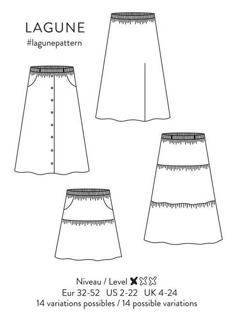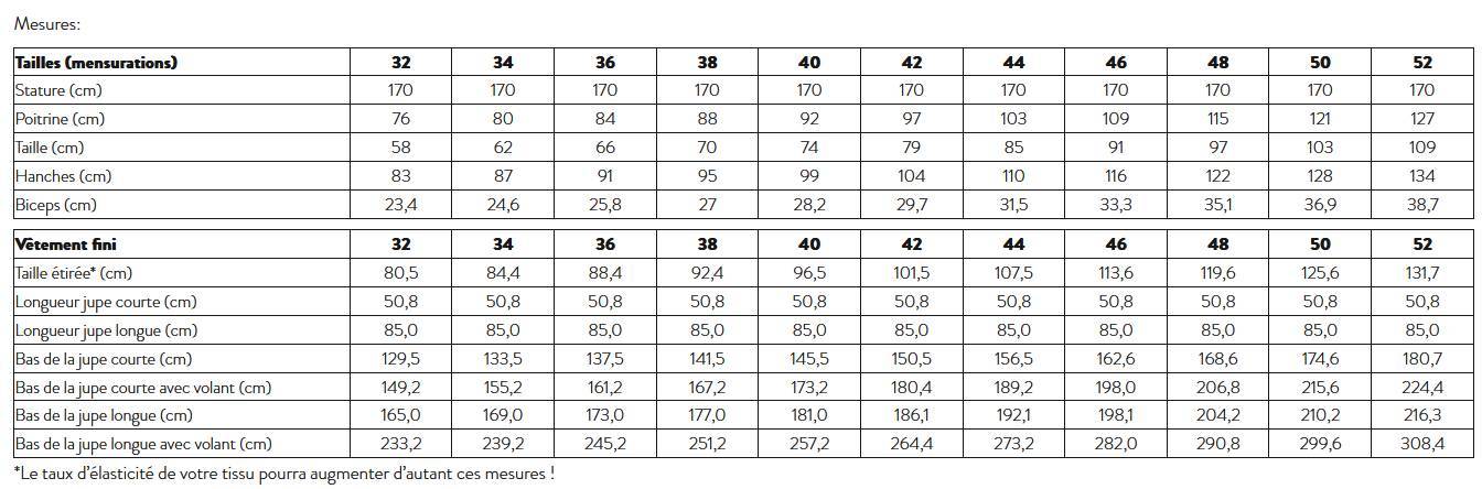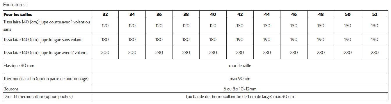 • Jupe courte ou longue au volume très flatteur. En plus du confort absolu conféré par sa taille élastiquée, ses nombreux atouts – tous en option – la rendront irrésistible: poches côté, boutonnage devant, fente à droite ou à gauche, ceinture avec passants, et ajout d’un ou deux volants. Finitions coutures anglaises autant que possible.
