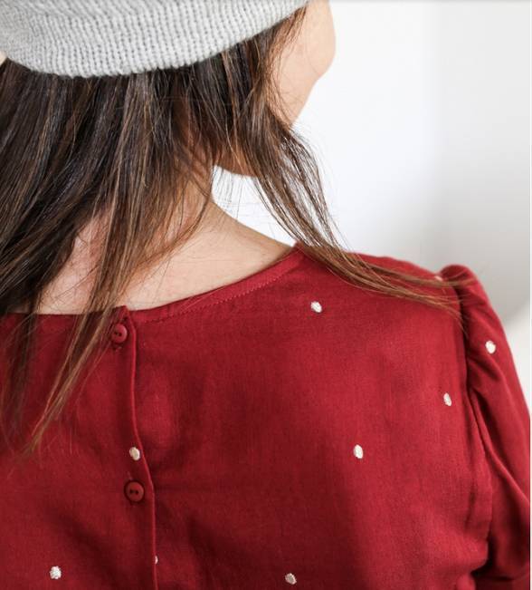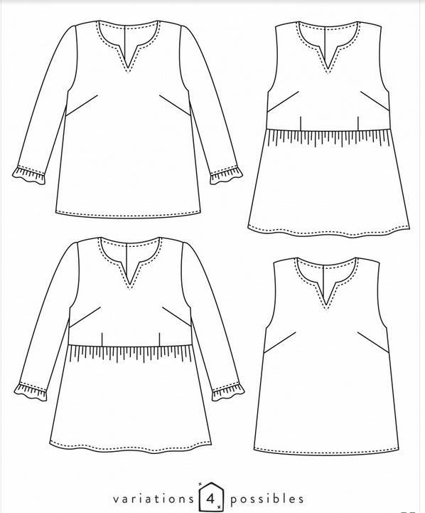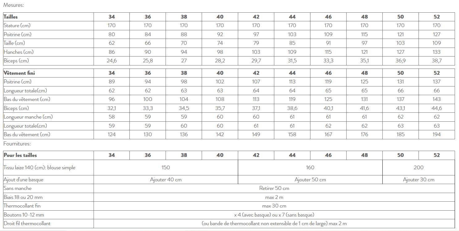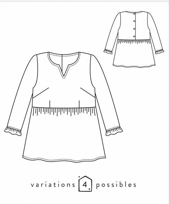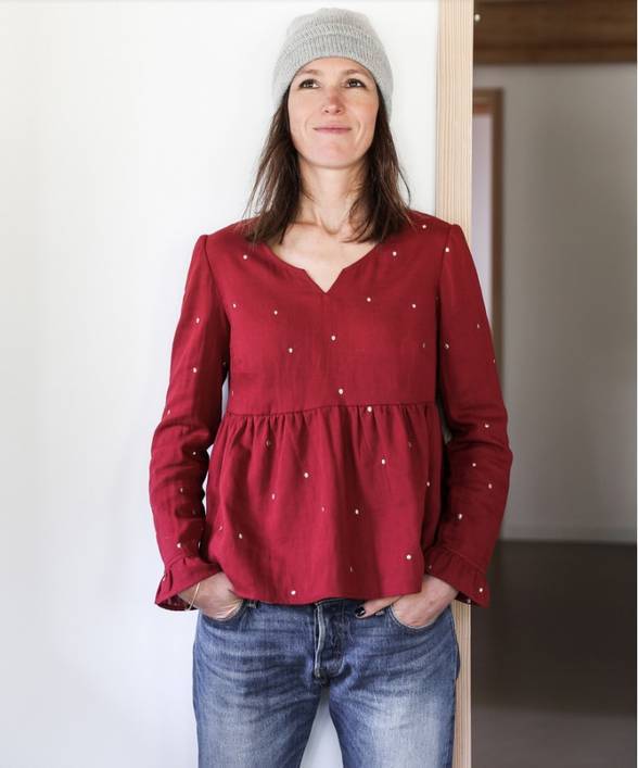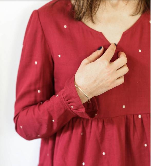 Blouse à l’encolure ronde avec petit décroché V finie par un biais plaqué ou une parementure. Patte de boutonnage au dos et manche longue terminée par un volant froncé. A décliner en blouse à basque froncée, le tout avec ou sans manche.