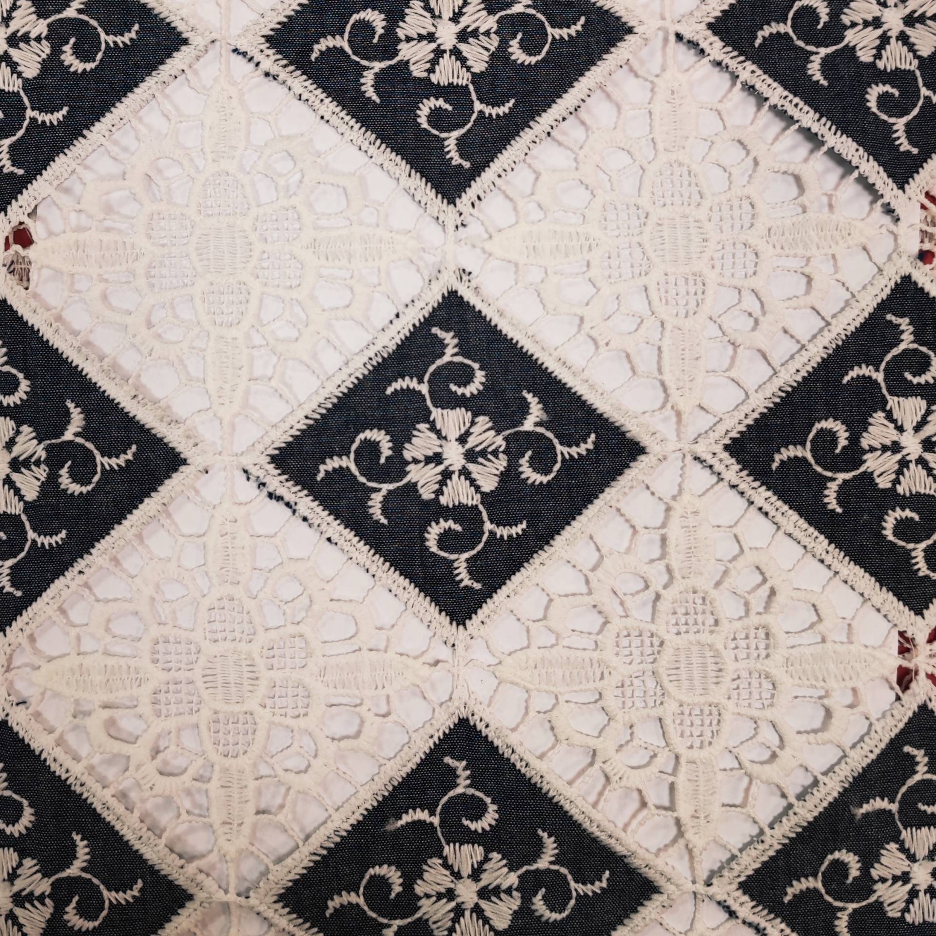 Jean brodé style broderie anglaise, avec des carrées en broderie anglaise fleuri.