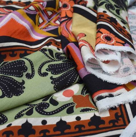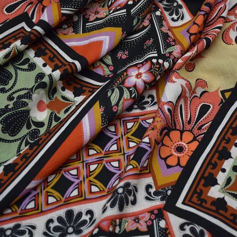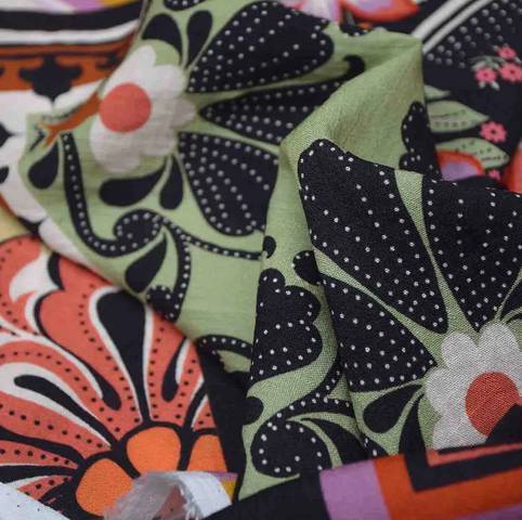 Ce tissu en crêpe de viscose est une véritable invitation au voyage, un souffle d’évasion à travers ses motifs et ses couleurs vibrantes.