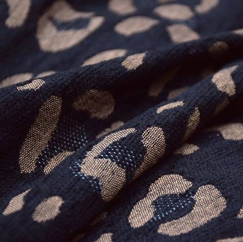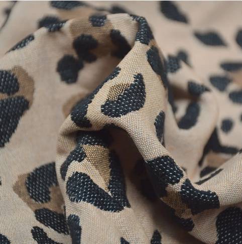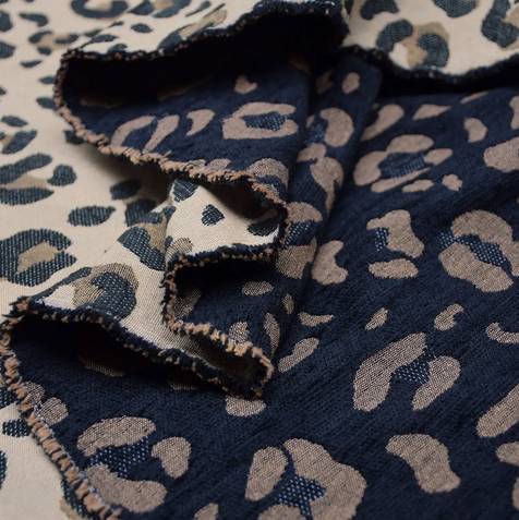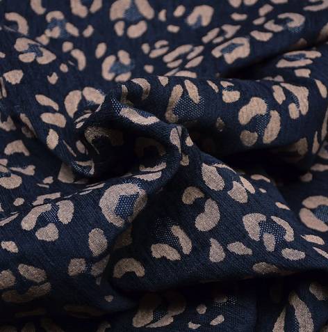 Jacquard à l’aspect velours sur une face. Son fond noir profond met en lumière un motif fauve dans des tons camel lumineux, pour un contraste riche et élégant.