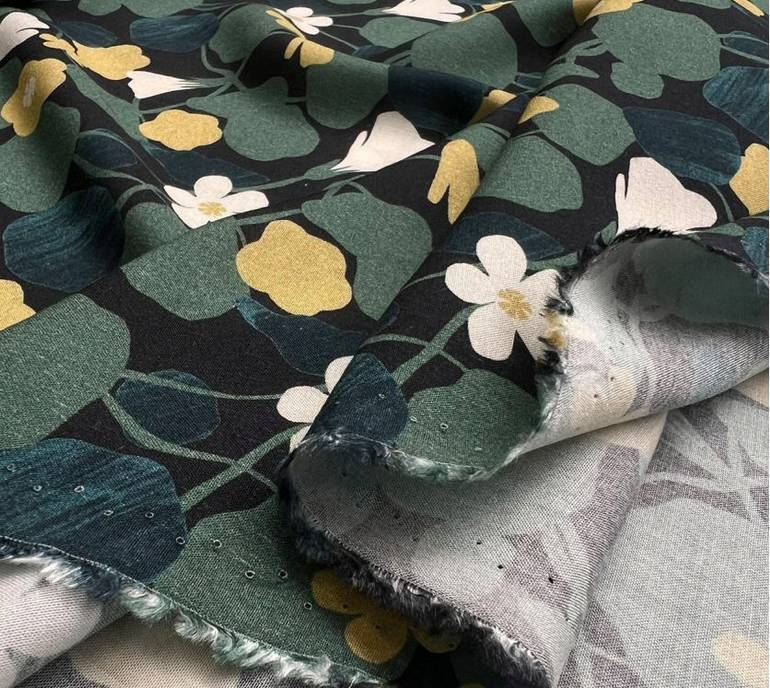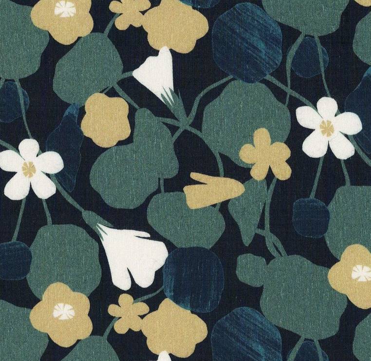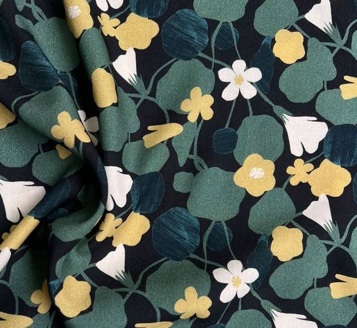 La viscose Capucine,un parterre de fleurs sur fond bleu nuit.