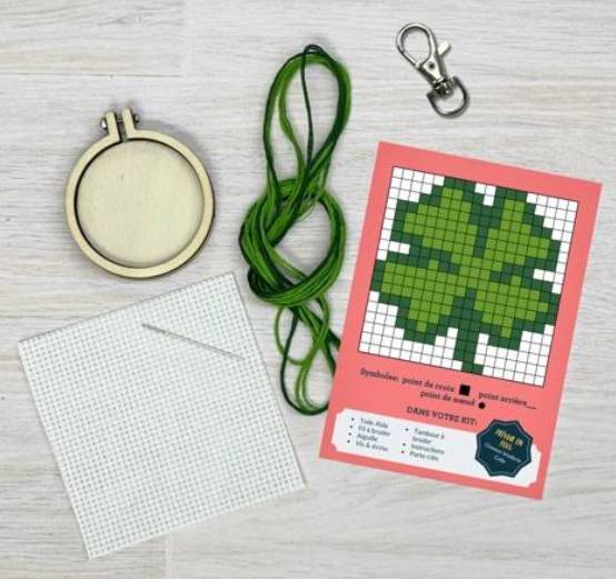 Le coffret contient tout le nécessaire pour broder un motif sur tambour de 5 cm, avec porte-clés inclus !