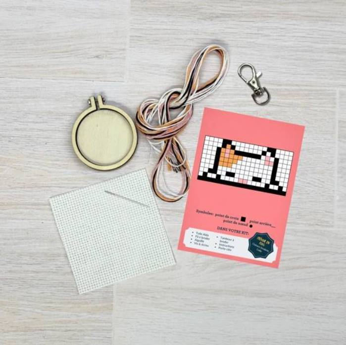 Le coffret contient tout le nécessaire pour broder un motif sur tambour de 5 cm, avec porte-clés inclus !