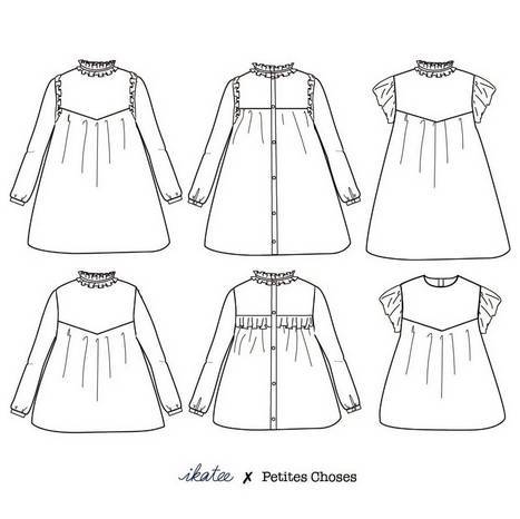 Manches longues avec poignet et fente ou manches courtes à large volant (esprit papillon) . Découpe en pointe devant, ouverture dos . Mini volants à l'emmanchure et volant dos en option . Un patron versatile, des créations dans l'air du temps. 2 modèles s’adaptant à toutes les saisons : été comme hiver.