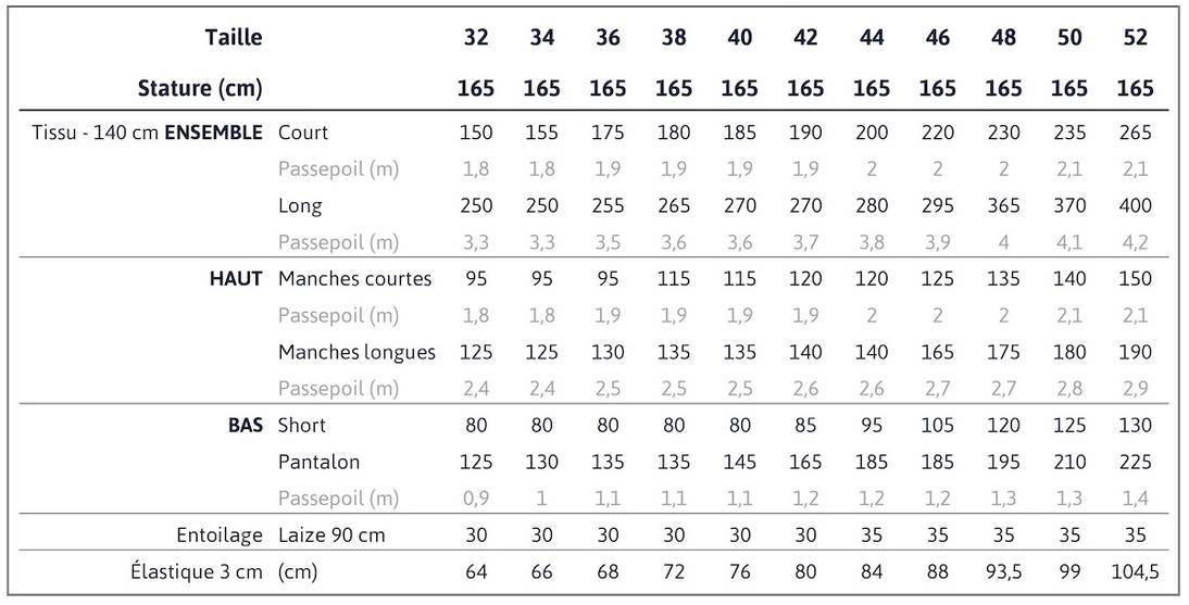 Les besoins en tissus sont indiqués pour le haut et le bas séparément dans le cas de tissus dépareillés, et en ensemble si un seul tissu (les besoins sont alors optimisés).