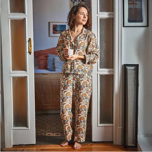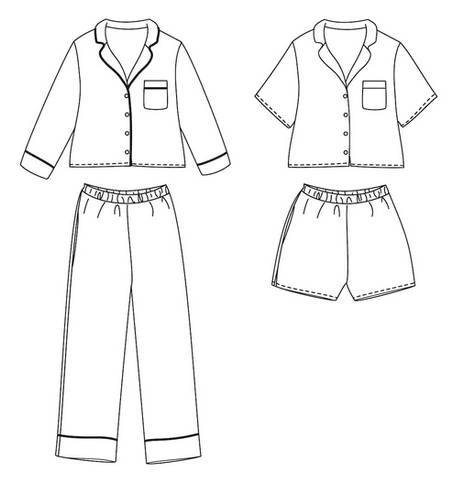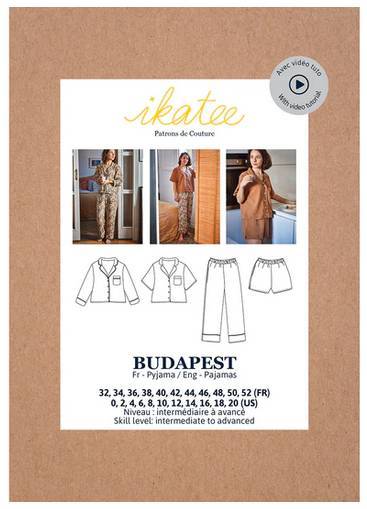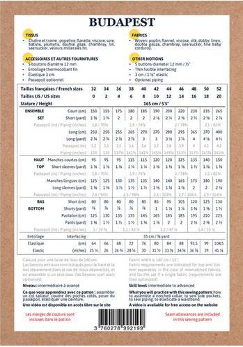 Budapest est un patron de pyjama pour femme composé d’un haut court et ample à col tailleur, et d’un bas large à taille élastiquée avec des poches côté. Le haut se décline en version manches longues avec bracelets aux poignets ou en version manches courtes. Le bas propose une option pantalon avec bracelets aux chevilles et une option short avec des fentes sur les côtés. L’ensemble peut être entièrement agrémenté d’une finition passepoil.