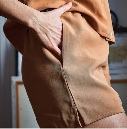 Ce que vous apprendrez avec ce patron : assembler un col tailleur, coudre des poches côtés, poser du passepoil, élastiquer une ceinture.