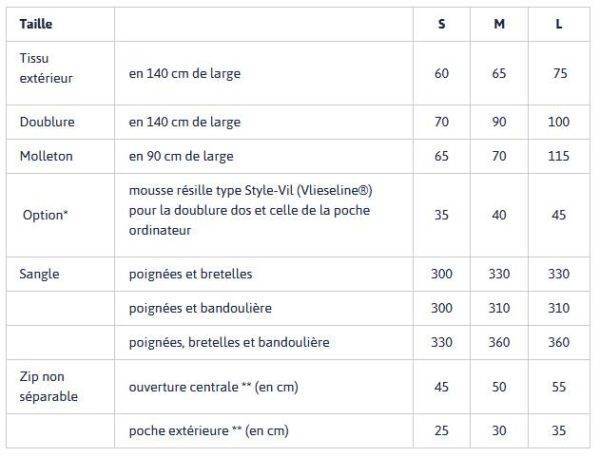 * l’usage de mousse résille se fait alors à la place de celle du molleton pour 1 pièce n°1C et pour la pièce 5B. Retirer dans ce cas 15 cm (pour les tailles S et M, et 30 cm pour la taille L) de besoins en molleton par rapport aux besoins indiqués dans le tableau.
