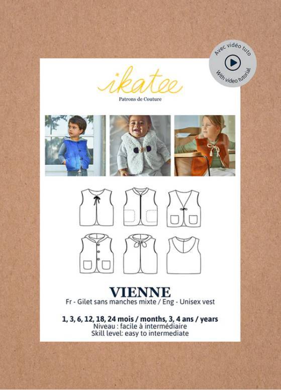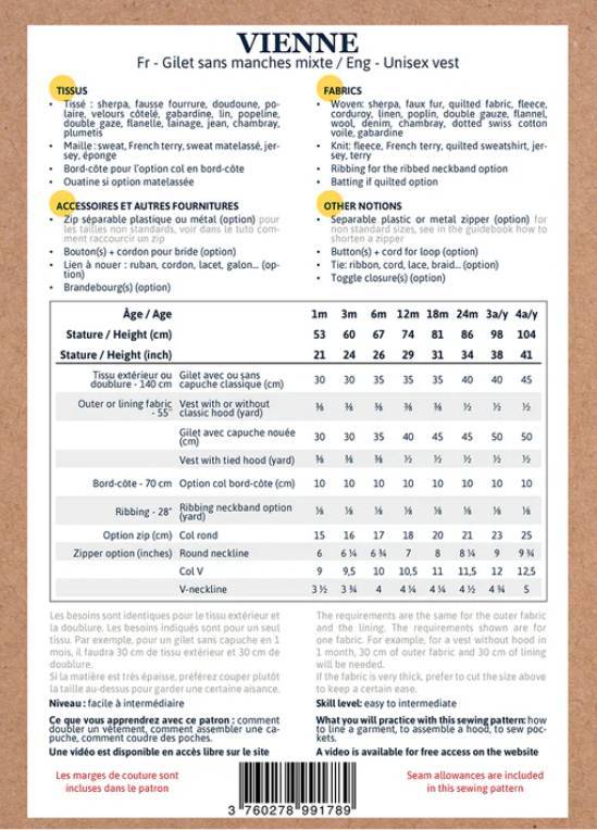 Vienne kids est un patron de gilet unisexe sans manches, pour enfant. Il est entièrement doublé, voir même réversible selon le type de fermeture. Ce patron dispose d’une belle variété d’options afin de pouvoir le personnaliser à votre convenance. Vous pouvez donc choisir parmi cinq options d’encolures (col V, col bord-côte, col rond, capuche classique, capuche à nouer), deux options de poches (plaquées, côté) et quatre types de fermetures (bouton + bride, lien à nouer, brandebourg, fermeture à glissière).