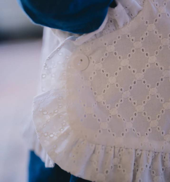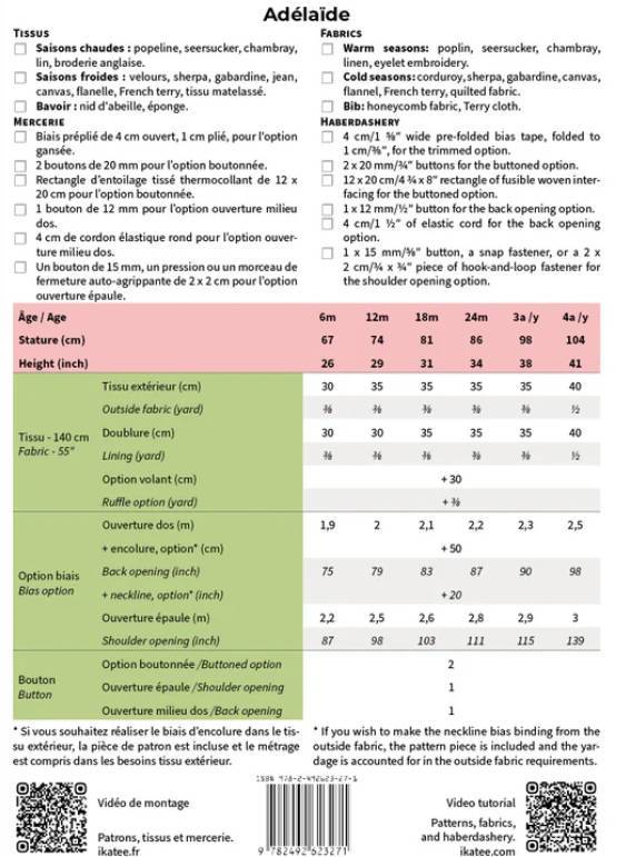 Adélaïde est un patron de plastron, pull sans manches ou bavoir pour bébé, avec des finitions très soignées. La forme est ample. Le modèle est entièrement doublé et en option, gansé. On peut ajouter ou non des volants. Le plastron se ferme avec des liens ou des boutons sur les cotés. Une ouverture est prévue au milieu dos, ou à l’épaule. Le plastron aussi pratique que mignon.