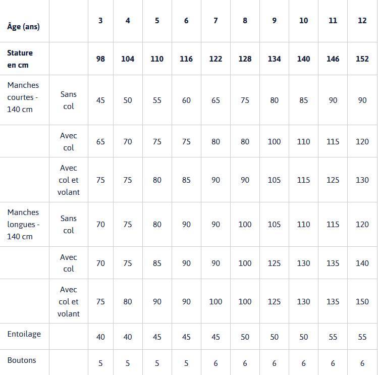Les besoins pour les versions avec col sont basés sur le plus grand col (col carré). Pour les cols plus petits (col officier, col chemise, col plat, col claudine), les besoins peuvent être légèrement réduits.