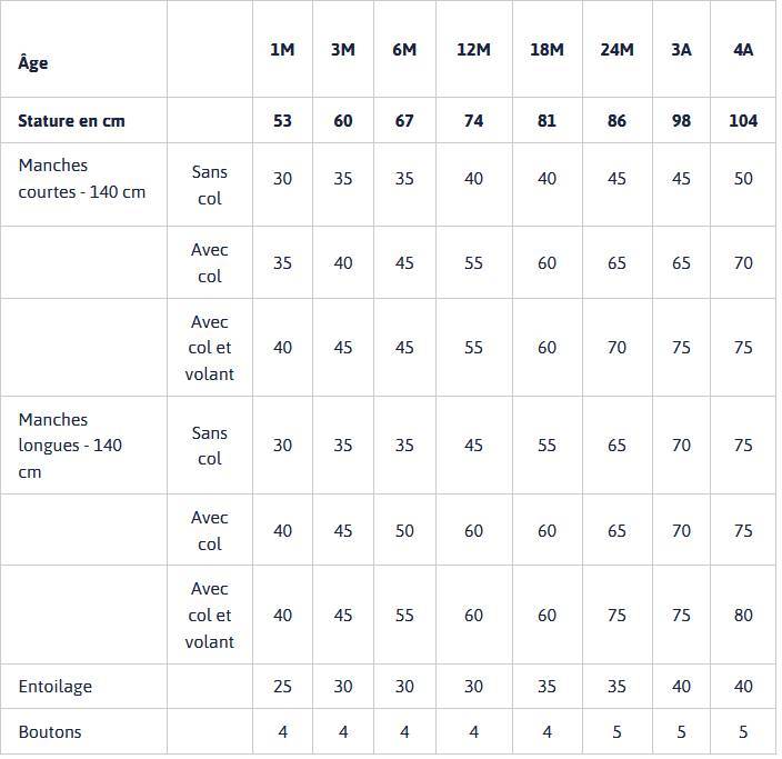 Les besoins pour les versions avec col sont basés sur le plus grand col (col carré). Pour les cols plus petits (col officier, col chemise, col plat, col claudine), les besoins peuvent être légèrement réduits.