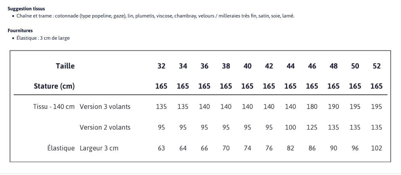 Gamme de tailles : 32, 34, 36, 38, 40, 42, 44, 46, 48, 50, 52