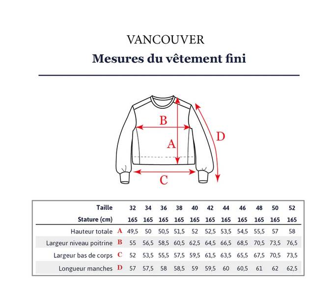 Gamme de tailles : 32, 34, 36, 38, 40, 42, 44, 46, 48, 50, 52