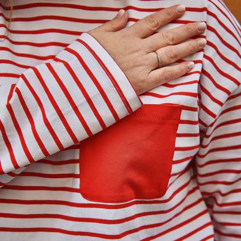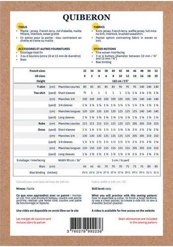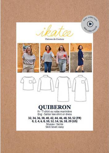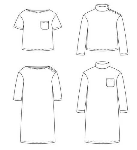 Patron de couture de t-shirt ou robe marinière pour femme. 2 options de col : encolure bateau ou col montant. 4 options de manches : courtes, 3/4 ou longues avec ou sans poignets. Poche poitrine, option ouverture à l’épaule et fente bas de top ou de robe.