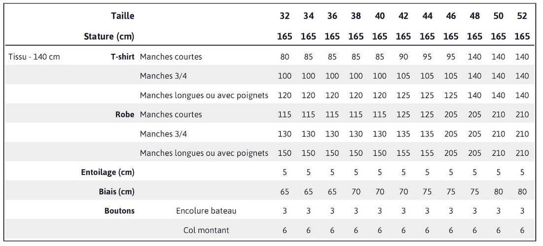 Gamme de tailles : 32, 34, 36, 38, 40, 42, 44, 46, 48, 50, 52