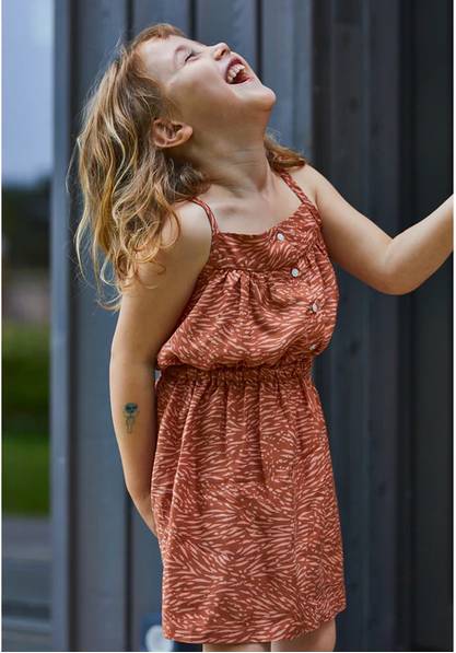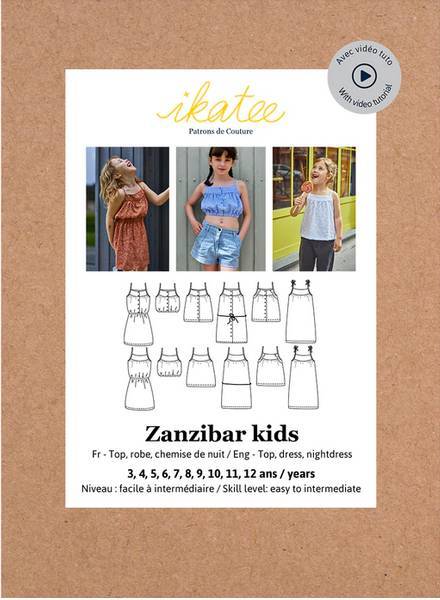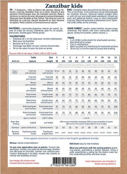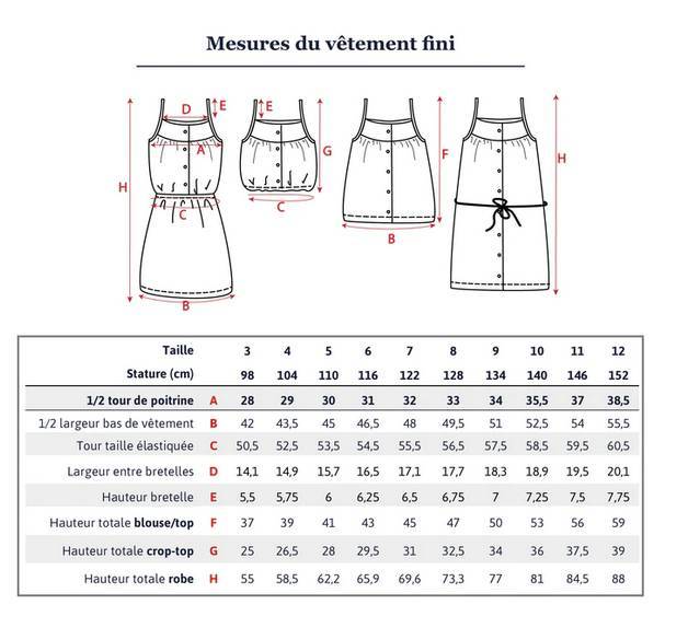 Bretelles fines ou à nouer. Devant et dos peuvent s’interchanger pour de multiples versions. Robe à ceinturer en option ou avec découpe et coulisse élastiquée. Découpe haut doublée et bas froncé. Top long ou court et élastiqué en crop-top. Devant boutonné ou sans boutons en option. Petits volants à l’emmanchure en option. Peut se porter en superposition sur un tee-shirt . Modèle à réaliser en tissé ou en maille jersey selon le look choisi