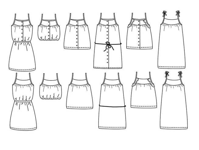 Bretelles fines ou à nouer. Devant et dos peuvent s’interchanger pour de multiples versions. Robe à ceinturer en option ou avec découpe et coulisse élastiquée. Découpe haut doublée et bas froncé. Top long ou court et élastiqué en crop-top. Devant boutonné ou sans boutons en option. Petits volants à l’emmanchure en option. Peut se porter en superposition sur un tee-shirt