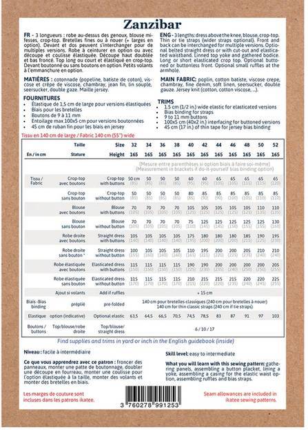 Ce que vous apprendrez avec ce patron : froncer des panneaux, monter une patte de boutonnage, doubler une découpe en fourreau, monter une coulisse pour l’option élastiquée à la taille, monter des volants et monter des bretelles en biais.