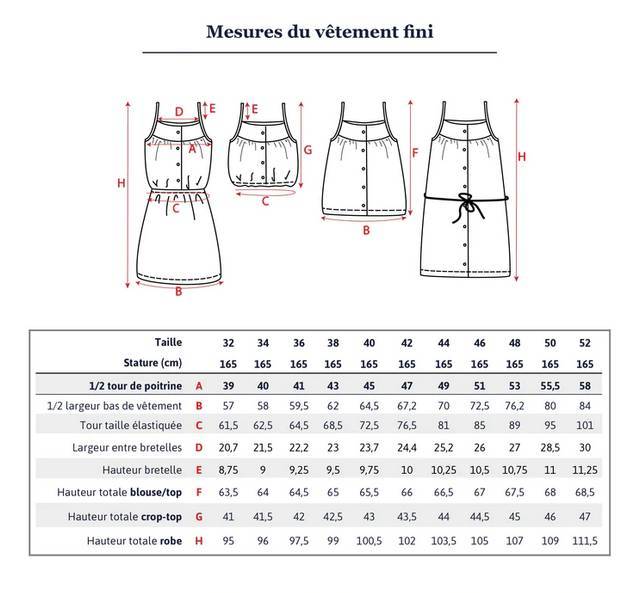 Gamme de tailles : 32, 34, 36, 38, 40, 42, 44, 46, 48, 50, 52