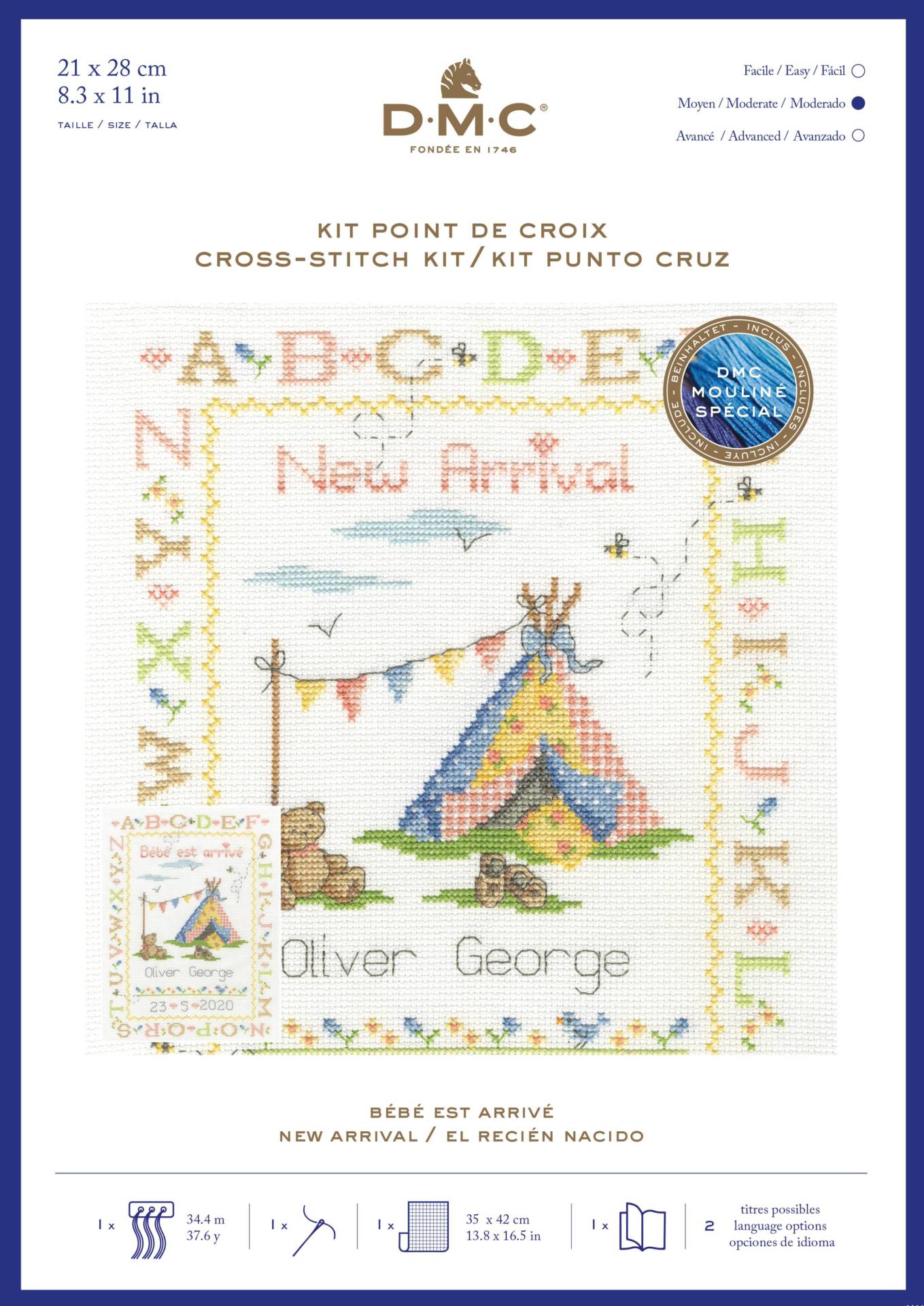 Kit point de croix bébé est arrivé, niveau moyen. Dimensions finies : 21 x 28 cm Contenu du kit : fil mouliné DMC avec organizer aiguille toile aïda 5.5 pts diagramme et instructions en anglais ou en français