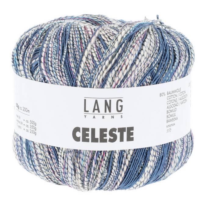 Celeste est composé de 80% de coton et de 20% de polyester qui font de lui un fil brillant. Rappelant les pierres précieuses, les couleurs sont éclatantes et lumineuses. Ce fil dégage un parfum de luxe. Vous allez adorer le travailler et, vous rayonnerez lorsque vous le porterez. Il est tout simplement sublime.
