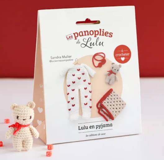 Grâce à ce kit crochet Lulu Compotine, vous prendrez plaisir à crocheter une grenouillère blanche à cœurs rouges, un ruban à cheveux, une couverture et un irrésistible ourson en peluche.