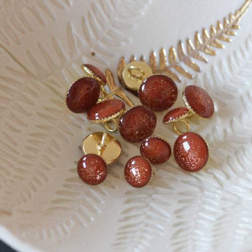 Joli petit bouton de bottine coloré et orné de paillettes dorées.
