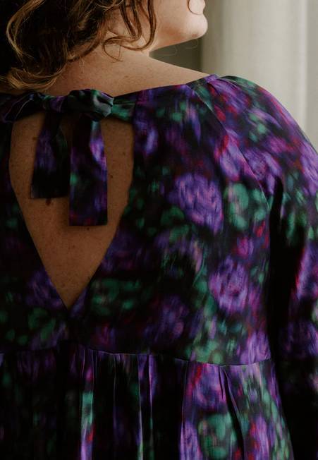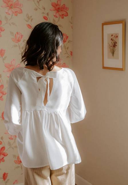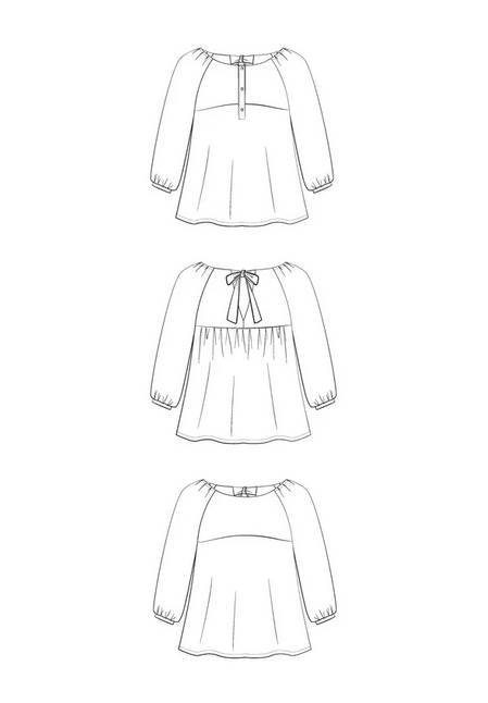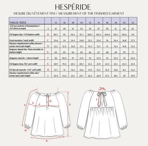 La blouse Hespéride est une petite merveille : sa ligne en corolle est travaillée par des empiècements, et son dos a un charme fou. Construite avec des manches raglans très confortables, l’encolure devant est dégagée et arrondie et se décline avec ou sans patte de boutonnage. La coupe est appuyée sur le haut du buste et s’évase sous l’empiècement devant sans adjonction de fronces pour ne pas créer de volume peu flatteur sur la poitrine. Le dos quant à lui est froncé sous empiècement pour apporter du mouvement, et se distingue par une ouverture fermée avec un large lien très féminin. Vaporeuse et romantique, la blouse Hespéride est irrésistible.