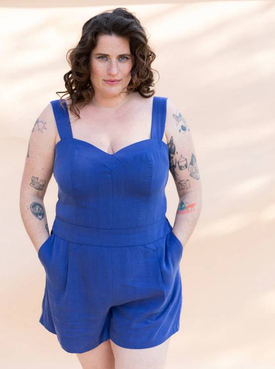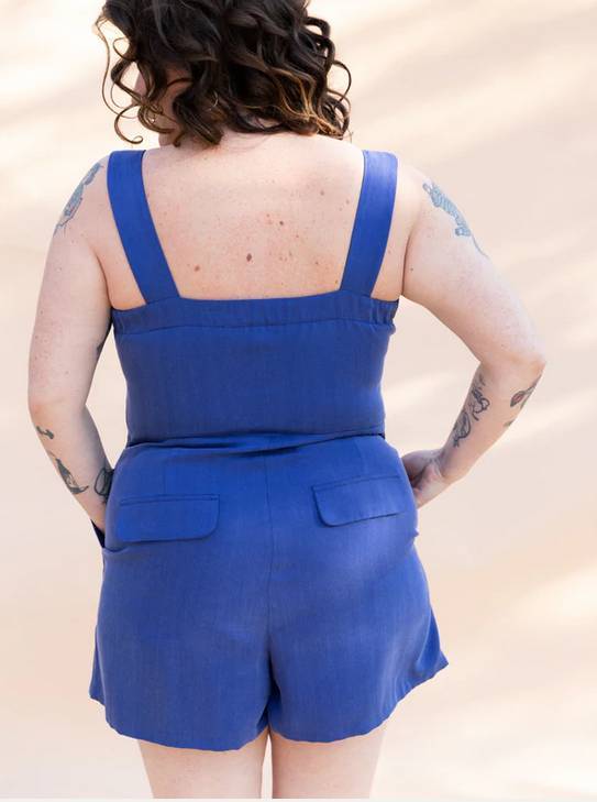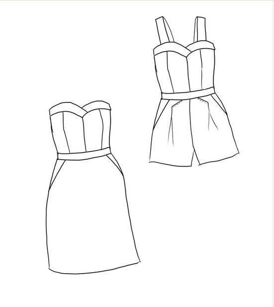 Expert. Les points techniques du patron sont l’incrustation sur le devant du short, le montage du bustier qui est entièrement doublé et avec plusieurs découpes, le montage du zip invisible côté.