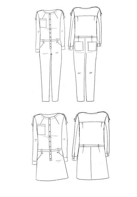 Des tissus de poids moyen (environ 200g/m2), comme du satin de coton, du velours, un jacquard ou un lainage fin,, du denim souple. Un peu d’élasticité sera souhaitée pour la version combipantalon (entre 2 et 3% d’elasthane).