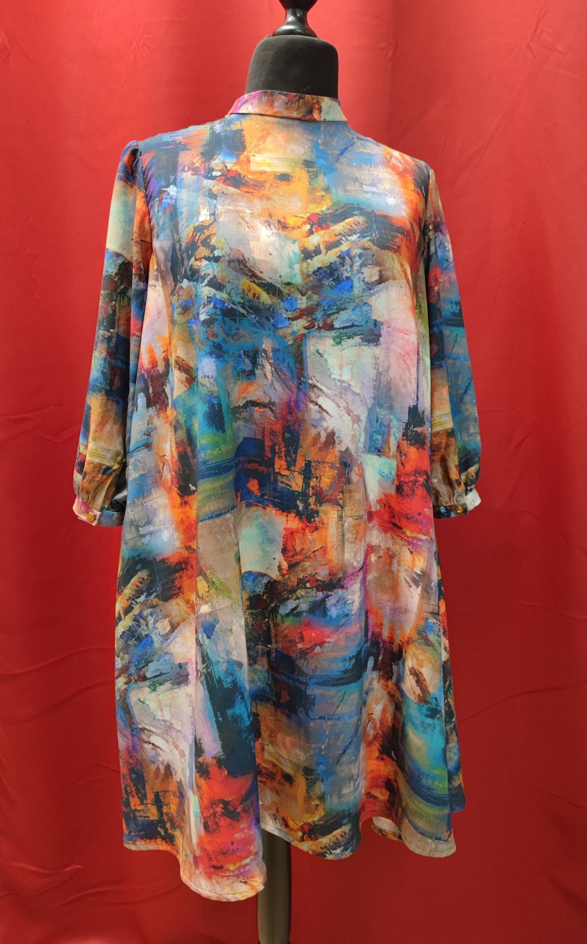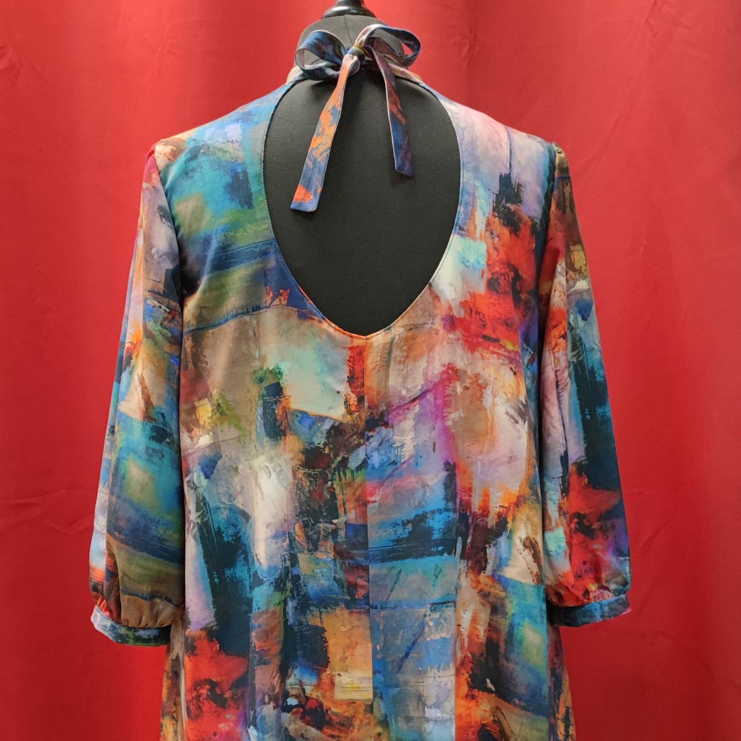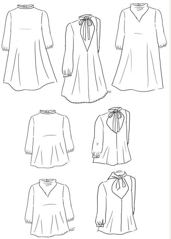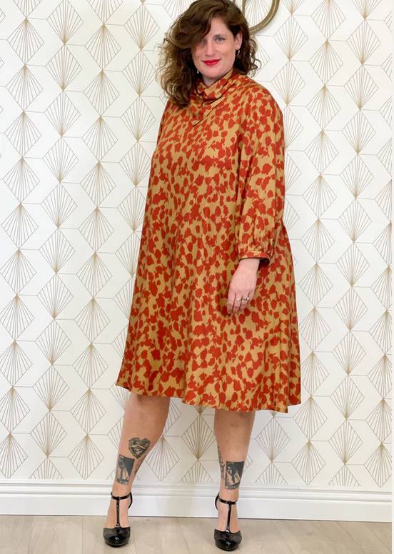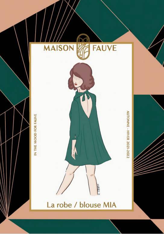 Patron couture robe : MIA De face : un col foulard étonnant ou un col officier très élégant et côté pile, un sage décolleté qui dégage le haut du dos ou un décolleté plus plongeant qui encanaille l’allure. La silhouette est aérienne, la coupe s’évase depuis la poitrine jusqu’au genou.