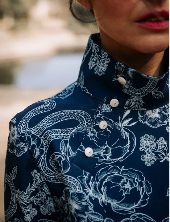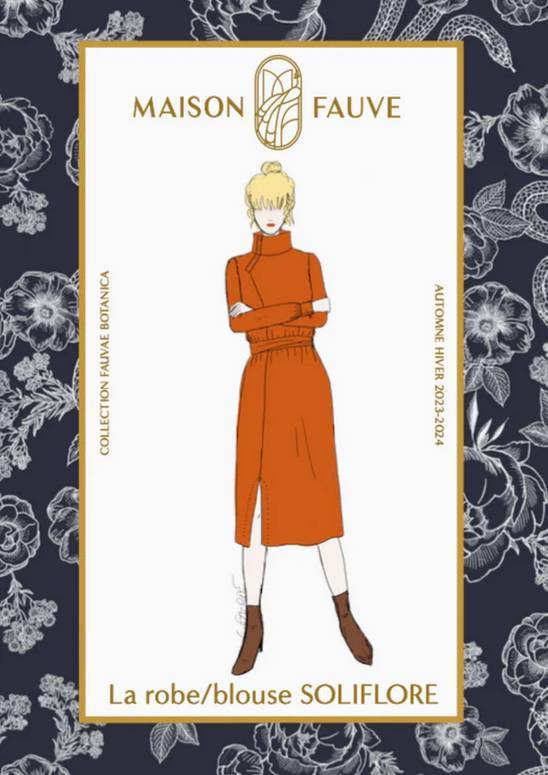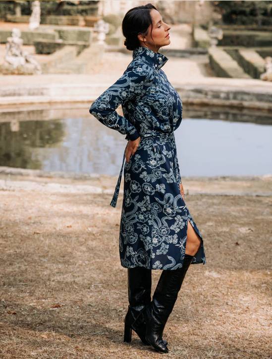 Une élégance discrète, une coupe épurée, sous son apparente simplicité la belle robe SOLIFLORE a une allure très affirmée : sa coupe droite est appuyée par une ceinture et la fente devant sur le côté féminise et dynamise la silhouette. Sa signature: un jeu de pince sur l’encolure dos, et un grand col qui élève sans enserrer le cou pour un port de tête altier, embelli par une patte de boutonnage qui permet de le porter fermé ou ouvert et rabattu.