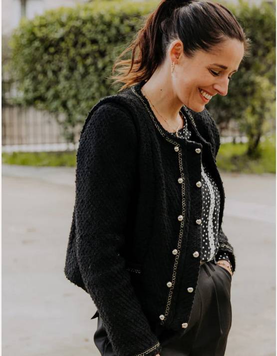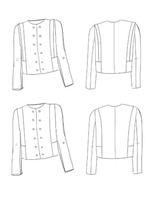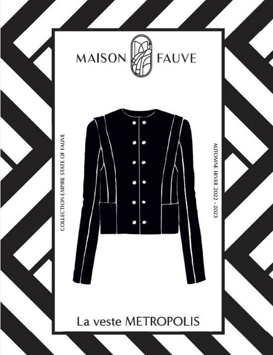 Cette veste très élégante ne tombe pas dans le classicisme : un jeu de double boutonnage en trompe l’œil, des lignes de construction qui structurent la coupe et dissimulent judicieusement des poches et LE détail Fauve de la belle METROPOLIS qui va définitivement signer le modèle : un jeu de bandes qui souligne les découpes.