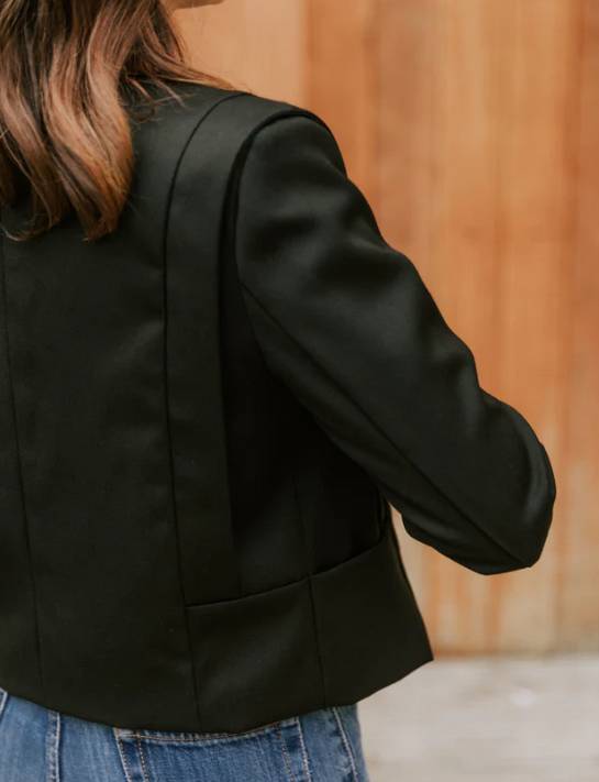 Aussi belle sur un jean qu’un pantalon taille haute, son volume est appuyé mais pas excessivement cintré. Ses bandes appliquées sont optionnelles, vous laissant la possibilité de miser sur l’audace ou l’épure.