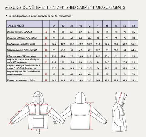 Le manteau RAFALE taille du 34 au 52. Le tableau des mesures du vêtement fini est disponible dans les photos du produit.