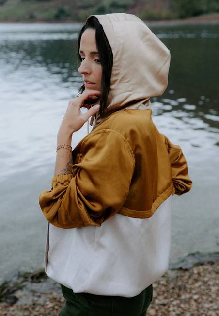 Des tissus souples et légers entre 70 et 200g/m2, comme du jean fin, des tissus enduits ou déperlants fins, mais également une gabardine fine, du sergé de poids moyen, du satin de coton. Pour la doublure de la capuche, un voile de coton sera le plus confortable.