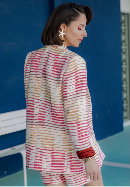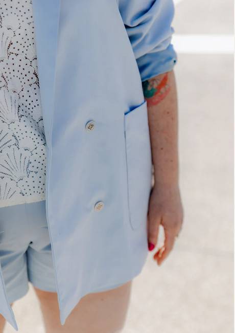 Élégant sans y penser, le blazer MIMOSA est la pièce forte de la collection Fauve Romance. Sa coupe droite est très construite par des manches en 2 parties, un petit côté, une fausse poche poitrine passepoilée et de très grandes poches plaquées arrondies dont le design rappelle le col châle et adoucit l’allure un peu boyish de cette veste au volume retravaillé et aux épaules marquées.