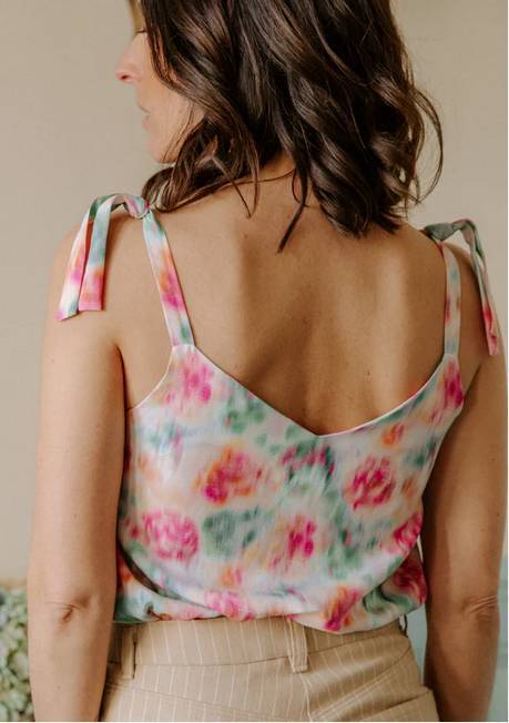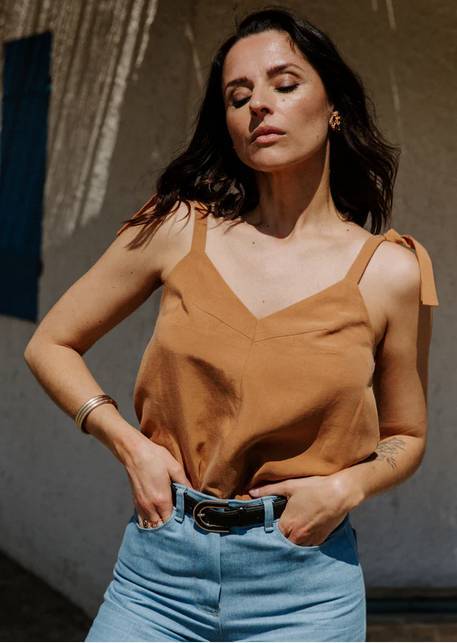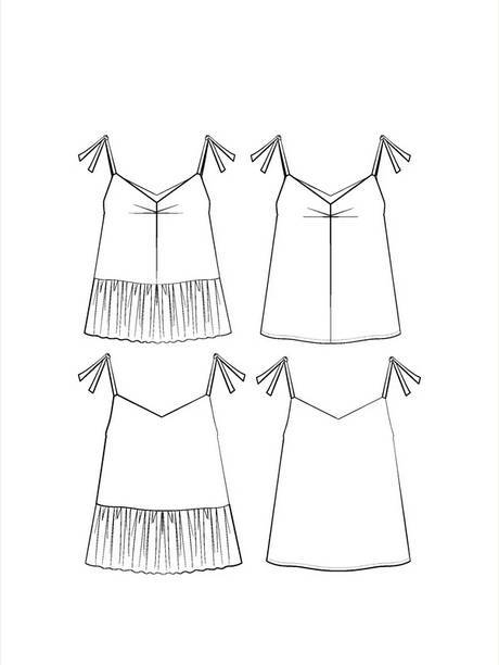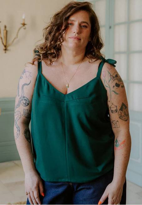 Belle Épine est un petit top au charme bohème et à l’allure résolument estivale. Délicat et très féminin, il se distingue par son détail de pinces qui rayonnent sur la poitrine, son décolleté en V devant et dos (dont l’échancrure permet de porter un soutien gorge), ses jolies bretelles à nouer et son volant en forme et froncé. Le patron est entièrement doublé, et le top du dessous est construit avec des pinces poitrines classiques. Une version sans doublure est également possible grâce à des pièces propreté encolure. Parfait compagnon pour les chaudes journées d’été, le patron se décline en plusieurs versions: avec ou sans volant, avec ou sans doublure, afin que vous puissiez décliner à l’envi votre modèle. Ce patron de couture est très facile à coudre, avec de jolies finitions, bref… Irrésistible !